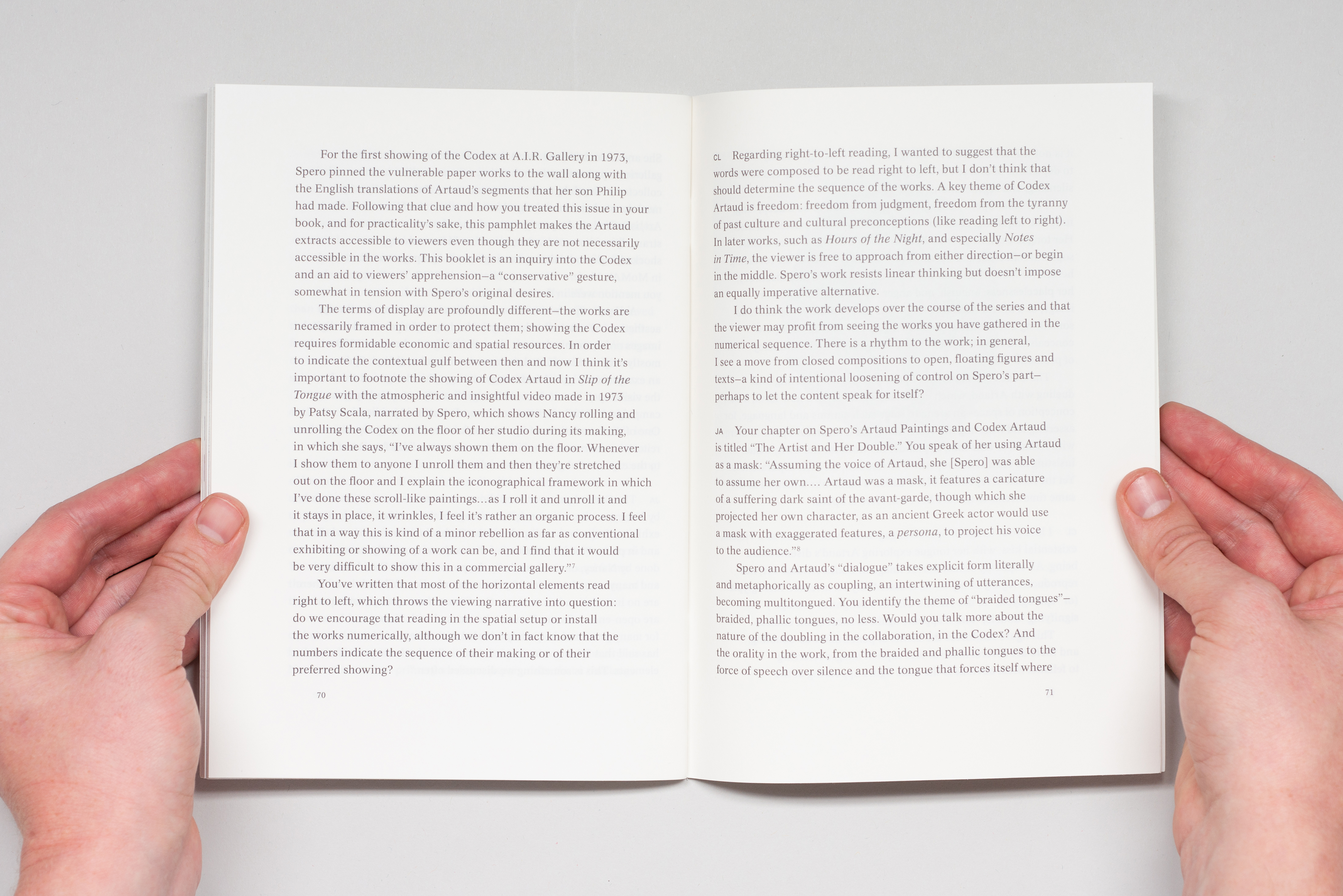 A booklet published on the occasion of the exhibition Slip of the Tongue curated by Danh Vo and Caroline Bourgeois for Punta della Dogana–Pinault Collection, Venezia, April 12, 2015–December 31, 2015. Providing museum visitors with an expanded experience of the work on view, the booklet includes a conversation between Julie Ault and Christopher Lyon, reprinted texts and image details from Nancy Spero’s Codex Artaud series, and an exhibition checklist.